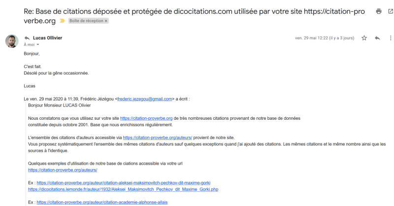 Malgré plusieurs demandes de suppression de l’ensemble des pages Lucas Ollivier semble moins gêné de laisser sur son site l’ensemble des auteurs de NOS citations avec références et ne répond plus 🙈🙉🙊 à aucun de nos mails. Aucun message à la date de rédaction de cet article (le 1 juin 2020).