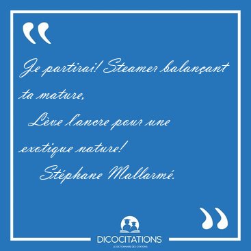 ![Je partirai! Steamer balançant ta mature, Lève l'ancre pour [...] - Stéphane Mallarmé... Je partirai! Steamer balançant ta mature, Lève l'ancre pour [...] - Stéphane Mallarmé...](/imagescitations/Je_partirai_Steamer_balancant_ta_mature_Leve_l_ancre_pour_-_Stephane_Mallarme-100150.jpg)