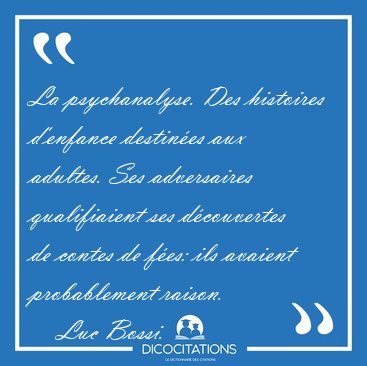 ![La psychanalyse. Des histoires d'enfance destinées aux adultes. [...] - Luc Bossi... La psychanalyse. Des histoires d'enfance destinées aux adultes. [...] - Luc Bossi...](/imagescitations/La_psychanalyse_Des_histoires_d_enfance_destinees_aux_adultes_-_Luc_Bossi-100581.jpg)