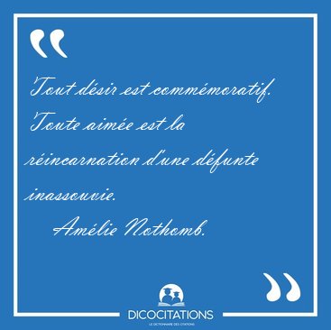 ![Tout désir est commémoratif. Toute aimée est la réincarnation [...] - Amélie Nothomb... Tout désir est commémoratif. Toute aimée est la réincarnation [...] - Amélie Nothomb...](/imagescitations/Tout_desir_est_commemoratif_Toute_aimee_est_la_reincarnation_-_Amelie_Nothomb-101894.jpg)