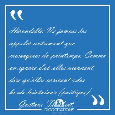 ![Hirondelle: Ne jamais les appeler autrement que messagères du [...] - Gustave Flaubert... Hirondelle: Ne jamais les appeler autrement que messagères du [...] - Gustave Flaubert...](/imagescitations/Hirondelle_Ne_jamais_les_appeler_autrement_que_messageres_du_-_Gustave_Flaubert-104153.jpg)
