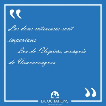 ![Les dons intéressés sont [...] - Luc de Clapiers, marquis de Vauvenargues... Les dons intéressés sont [...] - Luc de Clapiers, marquis de Vauvenargues...](/imagescitations/Les_dons_interesses_sont_-_Luc_de_Clapiers_marquis_de_Vauvenargues-105245.jpg)
