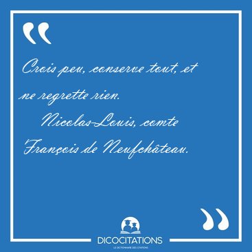 ![Crois peu, conserve tout, et ne regrette [...] - Nicolas-Louis, comte François de Neufchâteau... Crois peu, conserve tout, et ne regrette [...] - Nicolas-Louis, comte François de Neufchâteau...](/imagescitations/Crois_peu_conserve_tout_et_ne_regrette_-_Nicolas-Louis_comte_Francois_de_Neufchateau-105467.jpg)