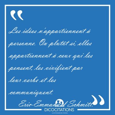 ![Les idées n'appartiennent à personne. Ou plutôt si, elles [...] - Eric-Emmanuel Schmitt... Les idées n'appartiennent à personne. Ou plutôt si, elles [...] - Eric-Emmanuel Schmitt...](/imagescitations/Les_idees_n_appartiennent_a_personne_Ou_plutot_si_elles_-_Eric-Emmanuel_Schmitt-106037.jpg)