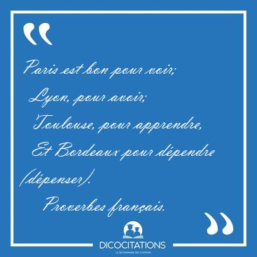 ![Paris est bon pour voir; Lyon, pour avoir; Toulouse, pour [...] - Proverbes français... Paris est bon pour voir; Lyon, pour avoir; Toulouse, pour [...] - Proverbes français...](/imagescitations/Paris_est_bon_pour_voir_Lyon_pour_avoir_Toulouse_pour_-_Proverbes_francais-107457.jpg)