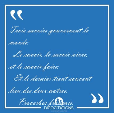 ![Trois savoirs gouvernent le monde: Le savoir, le [...] - Proverbes français... Trois savoirs gouvernent le monde: Le savoir, le [...] - Proverbes français...](/imagescitations/Trois_savoirs_gouvernent_le_monde_Le_savoir_le_-_Proverbes_francais-107713.jpg)