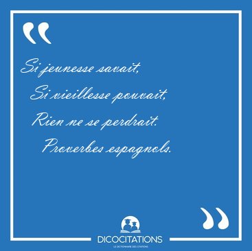 ![Si jeunesse savait, Si vieillesse pouvait, Rien ne se [...] - Proverbes espagnols... Si jeunesse savait, Si vieillesse pouvait, Rien ne se [...] - Proverbes espagnols...](/imagescitations/Si_jeunesse_savait_Si_vieillesse_pouvait_Rien_ne_se_-_Proverbes_espagnols-108438.jpg)