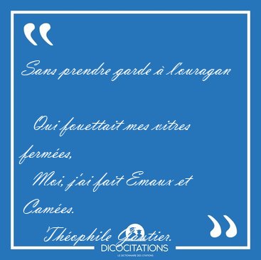 ![Sans prendre garde à l'ouragan Qui fouettait mes vitres [...] - Théophile Gautier... Sans prendre garde à l'ouragan Qui fouettait mes vitres [...] - Théophile Gautier...](/imagescitations/Sans_prendre_garde_a_l_ouragan_Qui_fouettait_mes_vitres_-_Theophile_Gautier-116007.jpg)