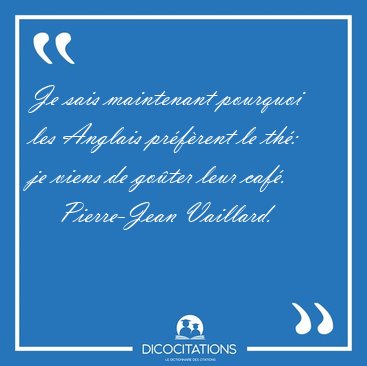 ![Je sais maintenant pourquoi les Anglais préfèrent le thé: je [...] - Pierre-Jean Vaillard... Je sais maintenant pourquoi les Anglais préfèrent le thé: je [...] - Pierre-Jean Vaillard...](/imagescitations/Je_sais_maintenant_pourquoi_les_Anglais_preferent_le_the_je_-_Pierre-Jean_Vaillard-11647.jpg)