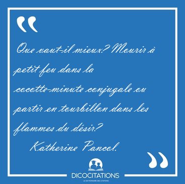 ![Que vaut-il mieux? Mourir à petit feu dans la cocotte-minute [...] - Katherine Pancol... Que vaut-il mieux? Mourir à petit feu dans la cocotte-minute [...] - Katherine Pancol...](/imagescitations/Que_vaut-il_mieux_Mourir_a_petit_feu_dans_la_cocotte-minute_-_Katherine_Pancol-116845.jpg)