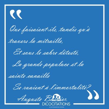 ![Que faisaient-ils, tandis qu'à travers la mitraille, Et sous [...] - Auguste Barbier... Que faisaient-ils, tandis qu'à travers la mitraille, Et sous [...] - Auguste Barbier...](/imagescitations/Que_faisaient-ils_tandis_qu_a_travers_la_mitraille_Et_sous_-_Auguste_Barbier-116886.jpg)