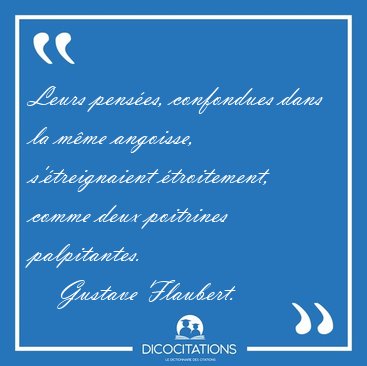![Leurs pensées, confondues dans la même angoisse, s'étreignaient [...] - Gustave Flaubert... Leurs pensées, confondues dans la même angoisse, s'étreignaient [...] - Gustave Flaubert...](/imagescitations/Leurs_pensees_confondues_dans_la_meme_angoisse_s_etreignaient_-_Gustave_Flaubert-117897.jpg)