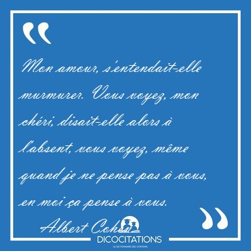 ![Mon amour, s'entendait-elle murmurer. Vous voyez, mon chéri, [...] - Albert Cohen... Mon amour, s'entendait-elle murmurer. Vous voyez, mon chéri, [...] - Albert Cohen...](/imagescitations/Mon_amour_s_entendait-elle_murmurer_Vous_voyez_mon_cheri_-_Albert_Cohen-118106.jpg)