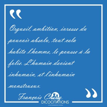 ![Orgueil, ambition, ivresse du pouvoir absolu, tout cela habite [...] - François Cheng... Orgueil, ambition, ivresse du pouvoir absolu, tout cela habite [...] - François Cheng...](/imagescitations/Orgueil_ambition_ivresse_du_pouvoir_absolu_tout_cela_habite_-_Francois_Cheng-118377.jpg)