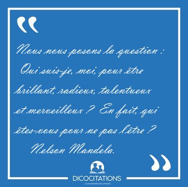 ![Nous nous posons la question : Qui suis-je, moi, pour être [...] - Nelson Mandela... Nous nous posons la question : Qui suis-je, moi, pour être [...] - Nelson Mandela...](/imagescitations/Nous_nous_posons_la_question_Qui_suis-je_moi_pour_etre_-_Nelson_Mandela-124872.jpg)