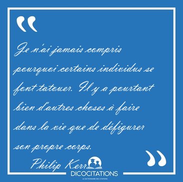 ![Je n'ai jamais compris pourquoi certains individus se font [...] - Philip Kerr... Je n'ai jamais compris pourquoi certains individus se font [...] - Philip Kerr...](/imagescitations/Je_n_ai_jamais_compris_pourquoi_certains_individus_se_font_-_Philip_Kerr-126630.jpg)