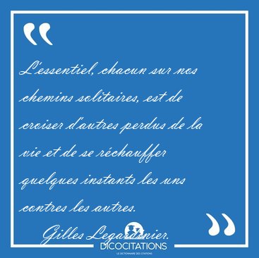 ![L'essentiel, chacun sur nos chemins solitaires, est de croiser [...] - Gilles Legardinier... L'essentiel, chacun sur nos chemins solitaires, est de croiser [...] - Gilles Legardinier...](/imagescitations/L_essentiel_chacun_sur_nos_chemins_solitaires_est_de_croiser_-_Gilles_Legardinier-128207.jpg)