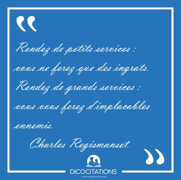 ![Rendez de petits services : vous ne ferez que des ingrats. [...] - Charles Regismanset... Rendez de petits services : vous ne ferez que des ingrats. [...] - Charles Regismanset...](/imagescitations/Rendez_de_petits_services_vous_ne_ferez_que_des_ingrats_-_Charles_Regismanset-132710.jpg)