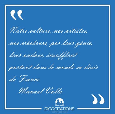 ![Notre culture, nos artistes, nos créateurs, par leur génie, leur [...] - Manuel Valls... Notre culture, nos artistes, nos créateurs, par leur génie, leur [...] - Manuel Valls...](/imagescitations/Notre_culture_nos_artistes_nos_createurs_par_leur_genie_leur_-_Manuel_Valls-133552.jpg)