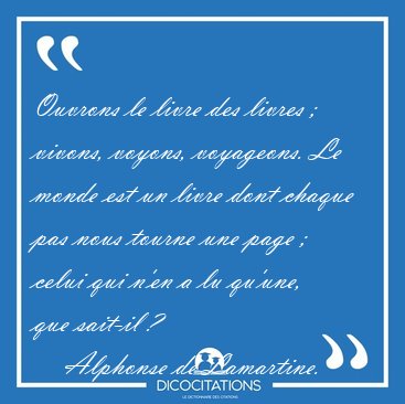 ![Ouvrons le livre des livres ; vivons, voyons, voyageons. Le [...] - Alphonse de Lamartine... Ouvrons le livre des livres ; vivons, voyons, voyageons. Le [...] - Alphonse de Lamartine...](/imagescitations/Ouvrons_le_livre_des_livres_vivons_voyons_voyageons_Le_-_Alphonse_de_Lamartine-134786.jpg)