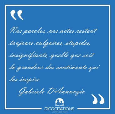 ![Nos paroles, nos actes restent toujours vulgaires, stupides, [...] - Gabriele D'Annunzio... Nos paroles, nos actes restent toujours vulgaires, stupides, [...] - Gabriele D'Annunzio...](/imagescitations/Nos_paroles_nos_actes_restent_toujours_vulgaires_stupides_-_Gabriele_D_Annunzio-135521.jpg)