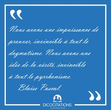 Nous avons une impuissance de prouver, invincible à tout le dogmatisme. Nous avons une idée de la vérité, invincible à tout le pyrrhonisme.