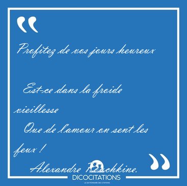 ![Profitez de vos jours heureux Est-ce dans la froide [...] - Alexandre Pouchkine... Profitez de vos jours heureux Est-ce dans la froide [...] - Alexandre Pouchkine...](/imagescitations/Profitez_de_vos_jours_heureux_Est-ce_dans_la_froide_-_Alexandre_Pouchkine-136211.jpg)