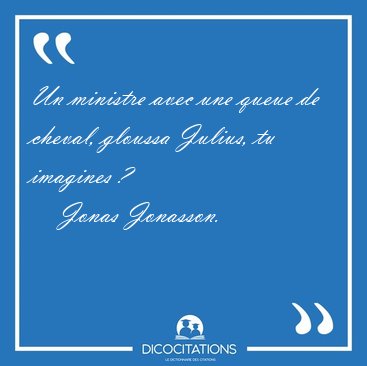 ![Un ministre avec une queue de cheval, gloussa Julius, tu [...] - Jonas Jonasson... Un ministre avec une queue de cheval, gloussa Julius, tu [...] - Jonas Jonasson...](/imagescitations/Un_ministre_avec_une_queue_de_cheval_gloussa_Julius_tu_-_Jonas_Jonasson-139943.jpg)