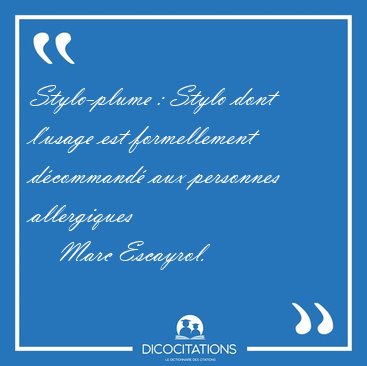 ![Stylo-plume : Stylo dont l'usage est formellement décommandé aux [...] - Marc Escayrol... Stylo-plume : Stylo dont l'usage est formellement décommandé aux [...] - Marc Escayrol...](/imagescitations/Stylo-plume_Stylo_dont_l_usage_est_formellement_decommande_aux_-_Marc_Escayrol-140110.jpg)