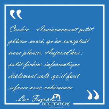 Cookie : Anciennement petit gâteau sucré, qu'on acceptait avec plaisir. Aujourd'hui : petit fichier informatique drôlement salé, qu'il faut refuser avec véhémence.