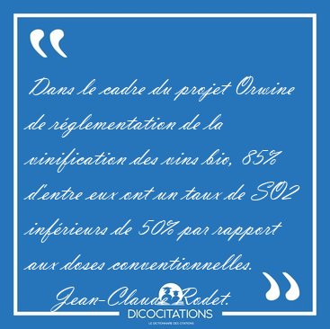 Dans le cadre du projet Orwine de réglementation de la vinification des vins bio, 85% d'entre eux ont un taux de SO2 inférieurs de 50% par rapport aux doses conventionnelles.