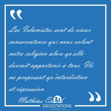 ![Les Islamistes sont de vieux conservateurs qui nous volent notre [...] - Mathias Enard... Les Islamistes sont de vieux conservateurs qui nous volent notre [...] - Mathias Enard...](/imagescitations/Les_Islamistes_sont_de_vieux_conservateurs_qui_nous_volent_notre_-_Mathias_Enard-143635.jpg)
