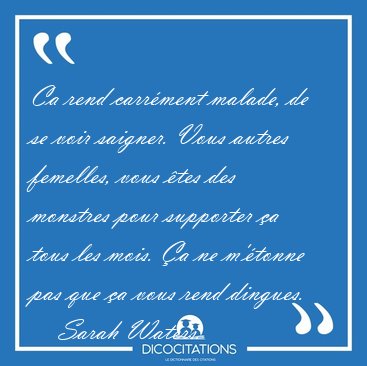 ![Ca rend carrément malade, de se voir saigner. Vous autres [...] - Sarah Waters... Ca rend carrément malade, de se voir saigner. Vous autres [...] - Sarah Waters...](/imagescitations/Ca_rend_carrement_malade_de_se_voir_saigner_Vous_autres_-_Sarah_Waters-145131.jpg)