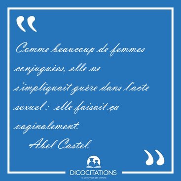 ![Comme beaucoup de femmes conjuguées, elle ne s'impliquait guère [...] - Abel Castel... Comme beaucoup de femmes conjuguées, elle ne s'impliquait guère [...] - Abel Castel...](/imagescitations/Comme_beaucoup_de_femmes_conjuguees_elle_ne_s_impliquait_guere_-_Abel_Castel-146221.jpg)