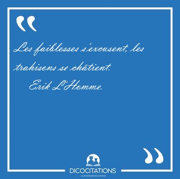 ![Les faiblesses s'excusent, les trahisons se [...] - Erik L'Homme... Les faiblesses s'excusent, les trahisons se [...] - Erik L'Homme...](/imagescitations/Les_faiblesses_s_excusent_les_trahisons_se_-_Erik_L_Homme-147242.jpg)
