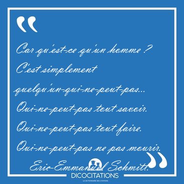 ![Car qu'est-ce qu'un homme ? C'est simplement [...] - Eric-Emmanuel Schmitt... Car qu'est-ce qu'un homme ? C'est simplement [...] - Eric-Emmanuel Schmitt...](/imagescitations/Car_qu_est-ce_qu_un_homme_C_est_simplement_-_Eric-Emmanuel_Schmitt-147624.jpg)