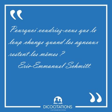 ![Pourquoi voudriez-vous que le loup change quand les agneaux [...] - Eric-Emmanuel Schmitt... Pourquoi voudriez-vous que le loup change quand les agneaux [...] - Eric-Emmanuel Schmitt...](/imagescitations/Pourquoi_voudriez-vous_que_le_loup_change_quand_les_agneaux_-_Eric-Emmanuel_Schmitt-148515.jpg)