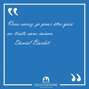 ![Vous savez, je peux être gaie ou triste sans [...] - Daniel Bardet... Vous savez, je peux être gaie ou triste sans [...] - Daniel Bardet...](/imagescitations/Vous_savez_je_peux_etre_gaie_ou_triste_sans_-_Daniel_Bardet-149122.jpg)