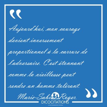 ![Aujourd'hui, mon courage devient inversement proportionnel à la [...] - Marie-Sabine Roger... Aujourd'hui, mon courage devient inversement proportionnel à la [...] - Marie-Sabine Roger...](/imagescitations/Aujourd_hui_mon_courage_devient_inversement_proportionnel_a_la_-_Marie-Sabine_Roger-149976.jpg)