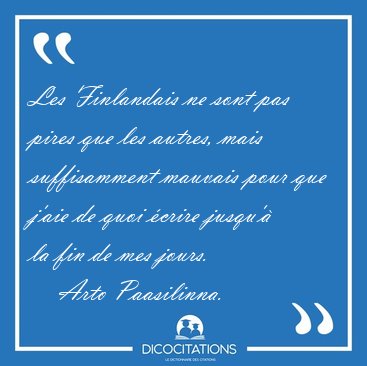 ![Les Finlandais ne sont pas pires que les autres, mais [...] - Arto Paasilinna... Les Finlandais ne sont pas pires que les autres, mais [...] - Arto Paasilinna...](/imagescitations/Les_Finlandais_ne_sont_pas_pires_que_les_autres_mais_-_Arto_Paasilinna-151423.jpg)
