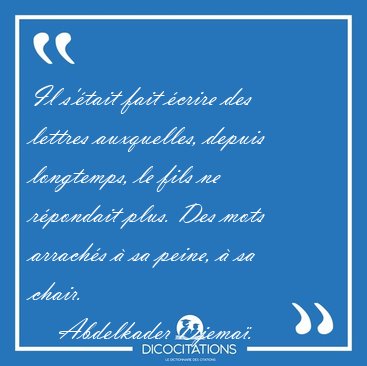 ![Il s'était fait écrire des lettres auxquelles, depuis longtemps, [...] - Abdelkader Djemaï... Il s'était fait écrire des lettres auxquelles, depuis longtemps, [...] - Abdelkader Djemaï...](/imagescitations/Il_s_etait_fait_ecrire_des_lettres_auxquelles_depuis_longtemps_-_Abdelkader_Djemai-151972.jpg)