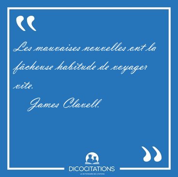 ![Les mauvaises nouvelles ont la fâcheuse habitude de voyager [...] - James Clavell... Les mauvaises nouvelles ont la fâcheuse habitude de voyager [...] - James Clavell...](/imagescitations/Les_mauvaises_nouvelles_ont_la_facheuse_habitude_de_voyager_-_James_Clavell-152631.jpg)
