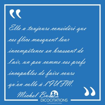 ![Elle a toujours considéré que ces flics masquent leur [...] - Michel Bussi... Elle a toujours considéré que ces flics masquent leur [...] - Michel Bussi...](/imagescitations/Elle_a_toujours_considere_que_ces_flics_masquent_leur_-_Michel_Bussi-159432.jpg)