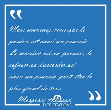 ![Mais souvenez-vous que le pardon est aussi un pouvoir. Le [...] - Margaret Atwood... Mais souvenez-vous que le pardon est aussi un pouvoir. Le [...] - Margaret Atwood...](/imagescitations/Mais_souvenez-vous_que_le_pardon_est_aussi_un_pouvoir_Le_-_Margaret_Atwood-161164.jpg)