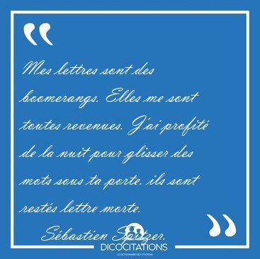 ![Mes lettres sont des boomerangs. Elles me sont toutes revenues. [...] - Sébastien Spitzer... Mes lettres sont des boomerangs. Elles me sont toutes revenues. [...] - Sébastien Spitzer...](/imagescitations/Mes_lettres_sont_des_boomerangs_Elles_me_sont_toutes_revenues_-_Sebastien_Spitzer-164567.jpg)