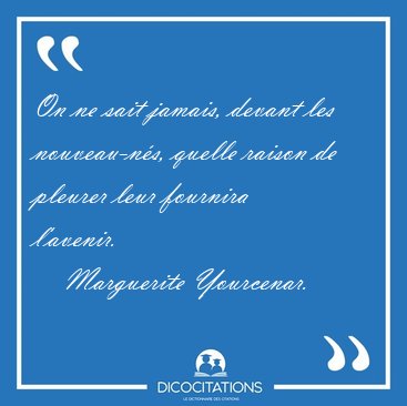 ![On ne sait jamais, devant les nouveau-nés, quelle raison de [...] - Marguerite Yourcenar... On ne sait jamais, devant les nouveau-nés, quelle raison de [...] - Marguerite Yourcenar...](/imagescitations/On_ne_sait_jamais_devant_les_nouveau-nes_quelle_raison_de_-_Marguerite_Yourcenar-169150.jpg)