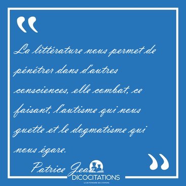 ![La littérature nous permet de pénétrer dans d'autres [...] - Patrice Jean... La littérature nous permet de pénétrer dans d'autres [...] - Patrice Jean...](/imagescitations/La_litterature_nous_permet_de_penetrer_dans_d_autres_-_Patrice_Jean-172631.jpg)