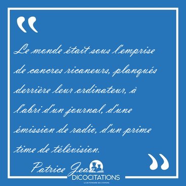 ![Le monde était sous l’emprise de cancres ricaneurs, planqués [...] - Patrice Jean... Le monde était sous l’emprise de cancres ricaneurs, planqués [...] - Patrice Jean...](/imagescitations/Le_monde_etait_sous_l_emprise_de_cancres_ricaneurs_planques_-_Patrice_Jean-172649.jpg)