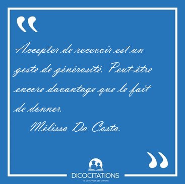 ![Accepter de recevoir est un geste de générosité. Peut-être [...] - Mélissa Da Costa... Accepter de recevoir est un geste de générosité. Peut-être [...] - Mélissa Da Costa...](/imagescitations/Accepter_de_recevoir_est_un_geste_de_generosite_Peut-etre_-_Melissa_Da_Costa-173092.jpg)