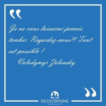 ![Je ne vous laisserai jamais tomber. Regardez-nous?! Tout est [...] - Volodymyr Zelensky... Je ne vous laisserai jamais tomber. Regardez-nous?! Tout est [...] - Volodymyr Zelensky...](/imagescitations/Je_ne_vous_laisserai_jamais_tomber_Regardez-nous_Tout_est_-_Volodymyr_Zelensky-174369.jpg)